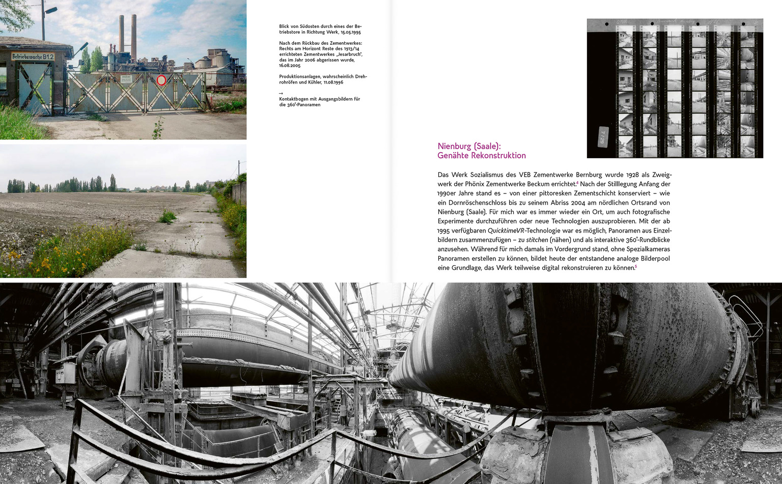 Für mich war es immer wieder ein Ort, um auch fotografische Experimente durchzuführen oder neue Technologien auszuprobieren. Mit der ab 1995 verfügbaren QuicktimeVR-Technologie war es möglich, Panoramen aus Einzelbildern zusammenzufügen – zu stitchen (nähen) und als interaktive 360°-Rundblicke anzusehen. Während für mich damals im Vordergrund stand, ohne Spezialkameras Panoramen erstellen zu können, bildet heute der entstandene analoge Bilderpool eine Grundlage, das Werk teilweise digital rekonstruieren zu können.[5]